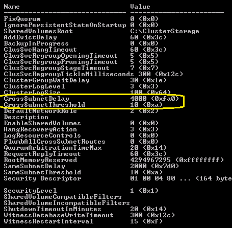 cluster /cluster:<ClusterName> /prop CrossSubnetDelay=<value> (value range: 250 – 4000)cluster /cluster:<ClusterName> /prop CrossSubnetThreshold=<value> (vlaue range: 3 – 10)