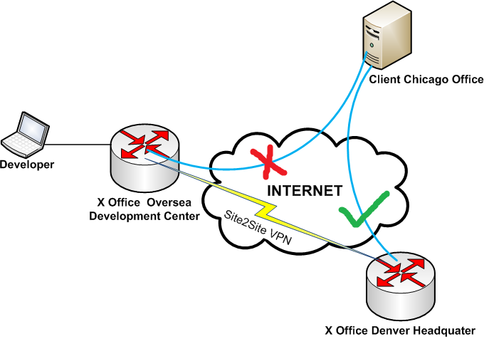 The project for that client will be done 50% by the Denver office and the other 50% by the oversea development center. According to the client’s security policy, only American IP address can be allowed to access their online resources. That is to say the developers in our oversea development center are not able to reach the client.