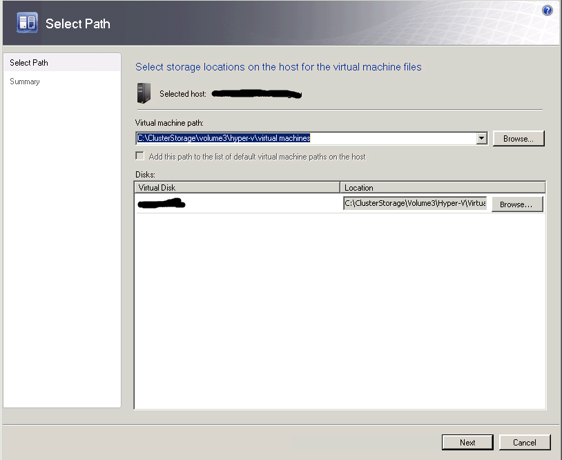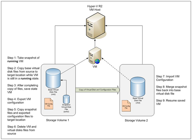 ‘Storage Migration’ is a very handy function in SCVMM 2008 R2. With this tool, you are able to move the VM storage (configuration file and VHD file) from one place to the other with minimum downtime (less than 1 minute).