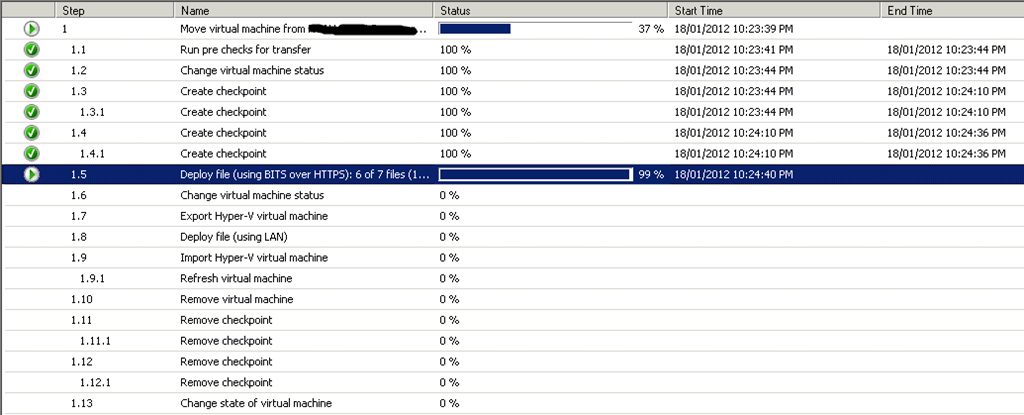 In the job log, you can track the progress of each step. The most time consuming one is the step 1.5, in which the host uses BITS to copy the VHD file from source to destination. If you don’t have a high speed network, it will take for a while.