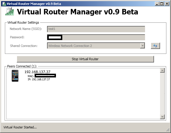 It turns my laptop into a Ad-hoc for my iPhone to access the sandbox environment. It is really awesome!! Start the Virtual Router, and you can see my iPhone has been connected.