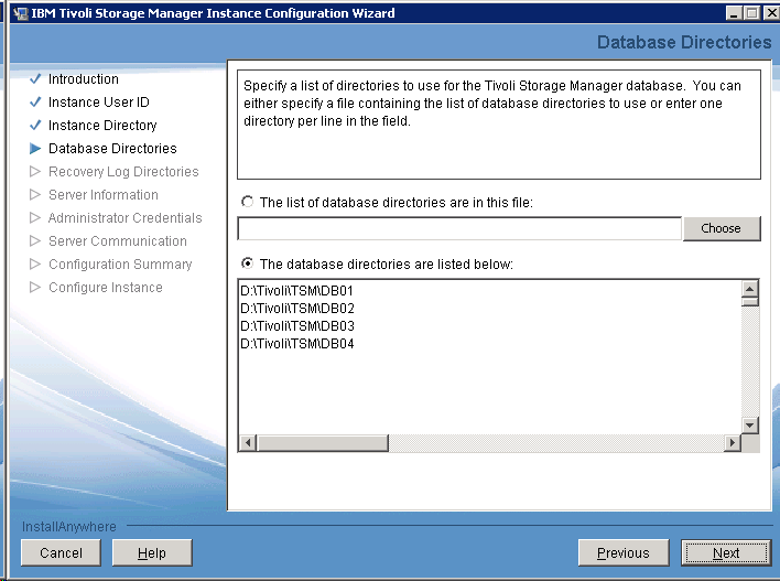Create DB01, DB02, DB03 and DB04 under D:\Tivoli\TSM\, then type the path in the following window.