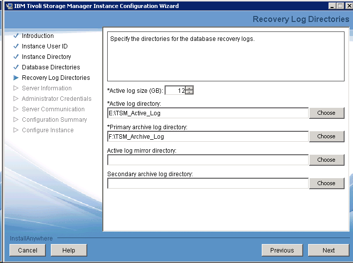 Create E:\TSM_Active_Log and F:\TSM_Archive_log folders, then choose them in the following window.