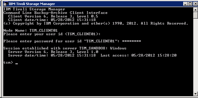 4) Login into the TSM admin console (dsmadmc.exe) to register the new client by running: register node TSM_Client01 Client01