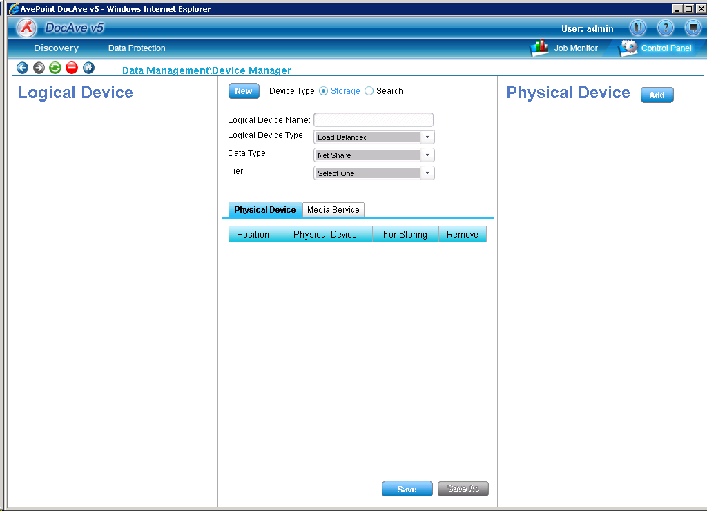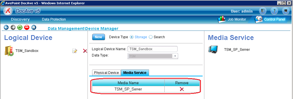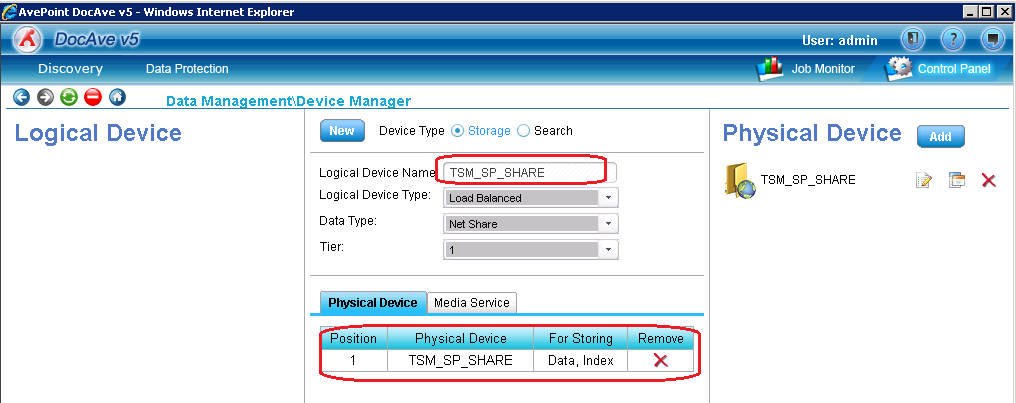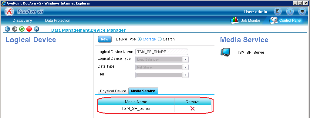 Create a logical device named ‘TSM_SP_SHARE’ then drag and drop ‘TSM_SP_Server’ into Media Service tab.