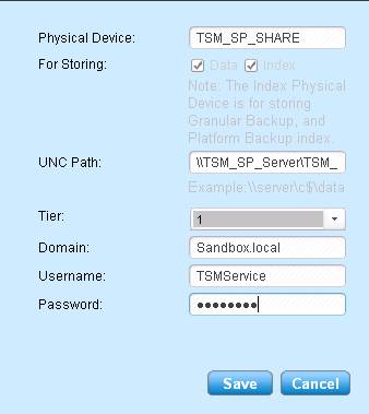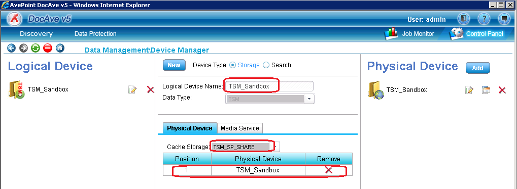 Create a logical device named ‘TSM_Sandbox’, then drag and drop TSM_Sandbox into the physical device, and choose ‘TSM_SP_SHARE’ in the cache storage field.