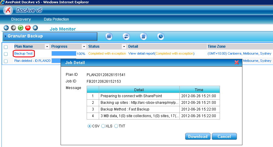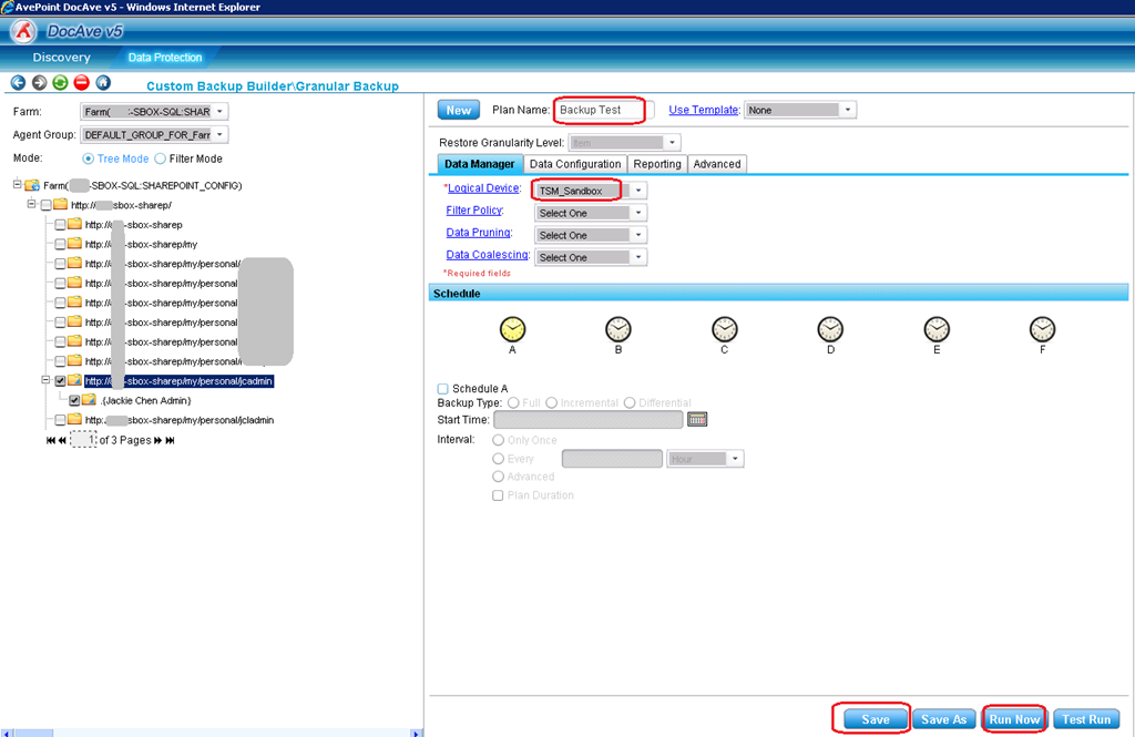 2) Login into the DocAve manager. Go to Data Protection and choose the SharePoint farm and default agent group. Give it a plan name and choose ‘TSM_Sandbox’ as the logical device. Click save then choose ‘Run Now’.