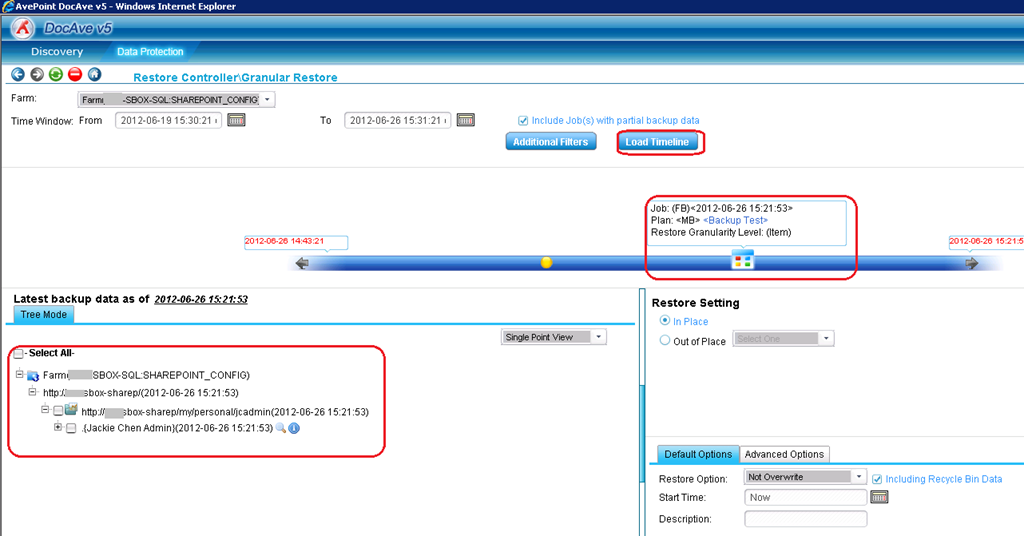 7) Choose Farm and the time range then click ‘Load Timeline’. Click the time point of the ‘Backup Test’. Then expand the tree.
