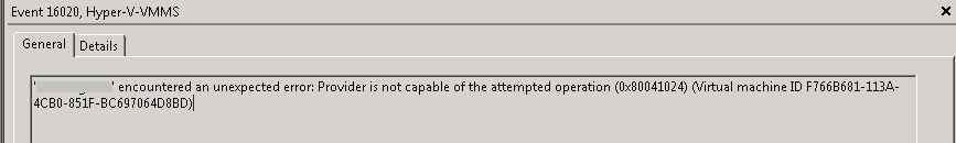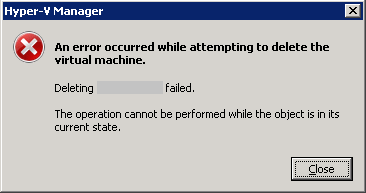If you see such errors in the Hyper-V event log, and fail to delete the damaged virtual machine in the Hyper-V manager. Just go to ‘C:\ProgramData\Microsoft\Windows\Hyper-V\Virtual Machines’ and delete the file which filename is the same as the virtual machine ID. After that, the damage virtual machine should be gone in your Hyper-V manager. If you use SCVMM, you need to delete the VM in the SCVMM console as well.