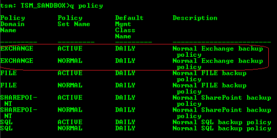 2) Login into TSM_Sandbox (the TSM server) to create Exchange policy domain policy and register the Exchange node.