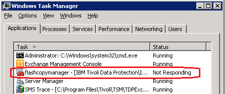 If the Flashcopy manager console always hangs while you are trying to restore the mailboxes. Firstly, try to install the Microsoft Visual C++ 2010 SP1 Redistributable Package (x86). It fixed the issue in my environment. If it does not work, try this one which has more work to do: http://www-01.ibm.com/support/docview.wss?uid=swg21404691