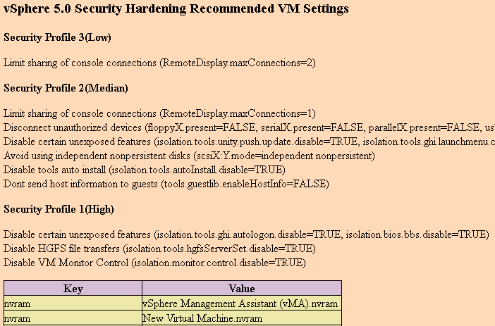 -pre “<h3>vSphere 5.0 Security Hardening Recommended VM Settings</h3> `