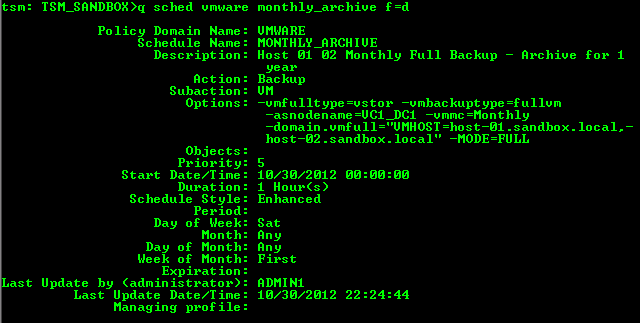 define sched vmware Monthly_Archive Schedstyle=Enhanced Desc=’Host 01 02 Monthly Full Backup – Archive for 1 year’ Action=Backup Subaction=VM OPTions=’-vmfulltype=vstor -vmbackuptype=fullvm -asnodename=VC1_DC1 -vmmc=Monthly -domain.vmfull=”VMHOST=host-01.sandbox.local,host-02.sandbox.local” -MODE=FULL’ DAYofweek=Saturday WEEKofmonth=First Startt=00:00:00