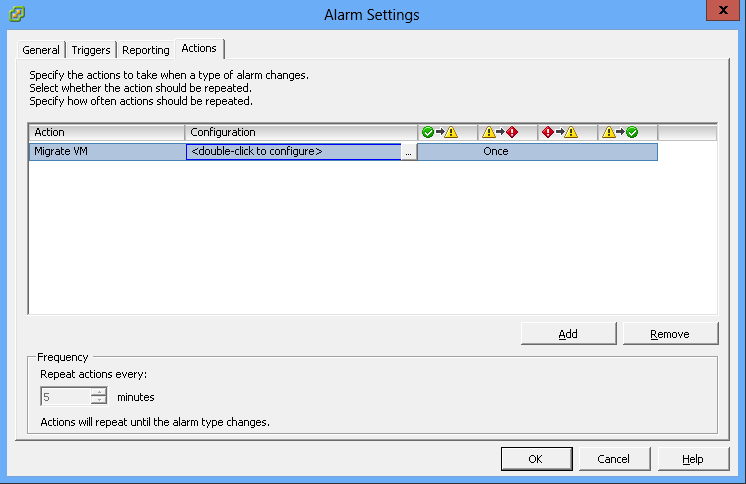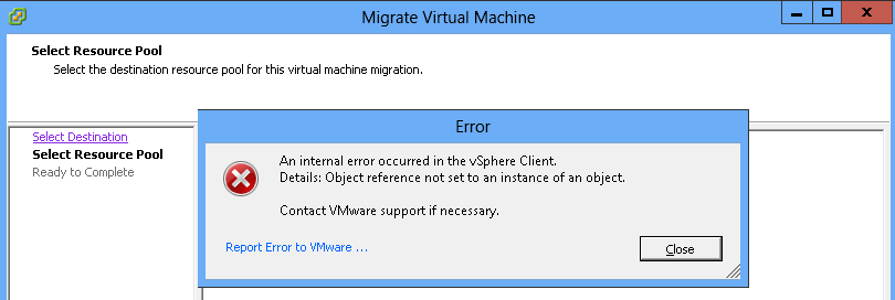 I tested this in both vSphere 5.0 and vSphere 5.1, and got the same results. I created a new alarm, and set the action as Migrate VM, and clicked <double-click to configure> that is displayed in the following diagram. Then I chose the host that I want the VM migrate to, once I clicked the Next button the Error windows pop up.