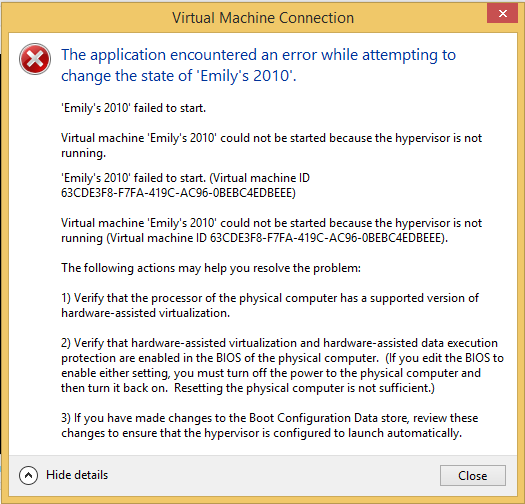 Run Hyper-V in HP EliteBook 8560W Jackie Chen Microsoft, Virtualization February 24, 2014February 24, 2014 1 Minute To use Hyper-V in HP EliteBook 8560W, besides ‘Virtual Technology‘ you also need to enable ‘Data Execution Prevention‘ in BIOS, otherwise you will see the following error when you try to start the virtual machine. Share this: Click to share on LinkedIn (Opens in new window) LinkedIn Click to share on X (Opens in new window) X Click to share on Facebook (Opens in new window) Facebook Click to email a link to a friend (Opens in new window) Email More Click to print (Opens in new window) Print Click to share on Reddit (Opens in new window) Reddit Like Loading... Related Published by Jackie Chen View all posts by Jackie Chen Published February 24, 2014February 24, 2014