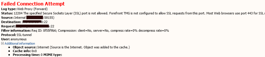 By default ISA/TMG does not allow outbound SSH traffic. And in the log it shows something like this: