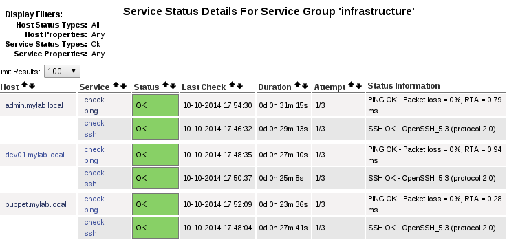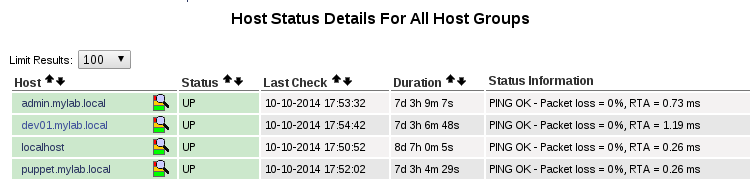 sys_nagios::client is the class for Nagios client, it sends the hosts’ facts to Puppet master then the data will be saved into the DB. sys_nagios::server is the class for Nagios server, it collects the latest data of the Nagios clients from the DB then generates the updated Nagios configuration files for host, hostgroup, service, servicegroup …