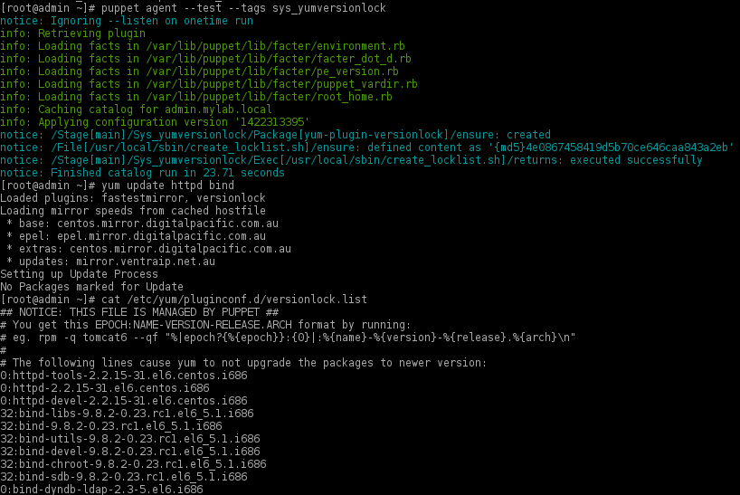 To exclude them from getting updated, I used a tool call yum-versionlock (for RHEL/CentOS 5.x)/ yum-plugin-versionlock (for RHEL/CentOS 6.x). And I pushed the tool and configurations via Puppet. Here is how it looks after I applied the module.