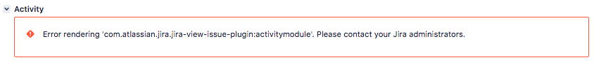 Error rendering ‘com.atlassian.jira.jira-view-issue-plugin:activitymodule’. Please contact your Jira administrators.