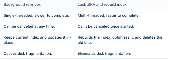 - The best combination is Jira Data Center + foreground re-index. As you can see above foreground re-index is quicker and offers better performance in terms of optimized index and disk fragmentation. Jira Data Center supports multiple nodes, so you can take one node out of the load balancer to lock it up and rebuild the index. Meanwhile, other nodes still serve the traffics as normal. After the re-indexing is finished, Jira will automatically distribute the new index to other nodes.