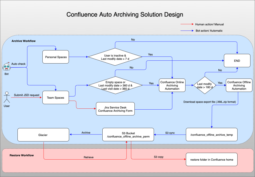 I have been working on the Confluence space archiving project recently. Here is my design which is already in production. And it works like a charm π
