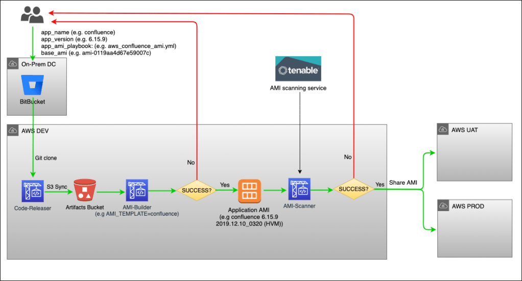 I have been working on a project of migrating Atlassian suites (Confluence/Jira/…) to AWS. This is not a simple lift and shift migration. We actually redesigned everything from ground up. Here is the CICD that I designed. The source codes are stored in on-premise BitBucket, the build tools is AWS Dev Tools (mainly CodeBuild).
