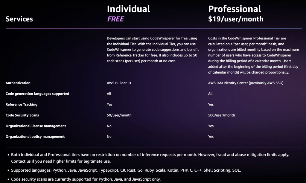 As an individual user, you get unlimited number for code suggestions and 50 code security scan each month. Comparing to GitHub Copilot $10/month for individual, this is free lunch!