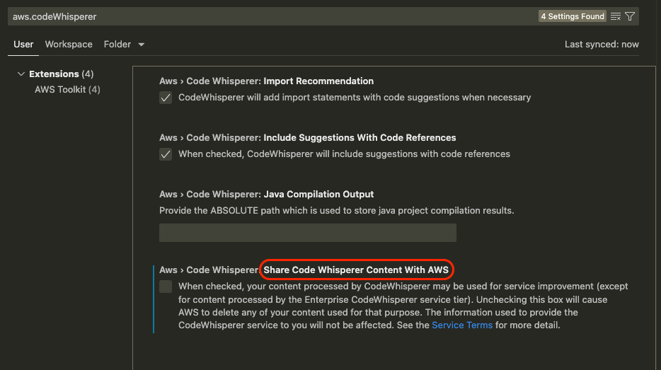 It is worth mentioning that as an individual if you don’t want to share your contents with CodeWhisperer for service improvement, then make sure you uncheck the following option in the AWS Toolkit extension.