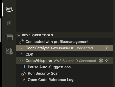 - Setup connection in CodeWhisperer with your AWS Builder ID. Now you can start to use it – Open a source code file, then you start the Auto-Suggestions or run the Security Scans.