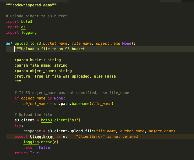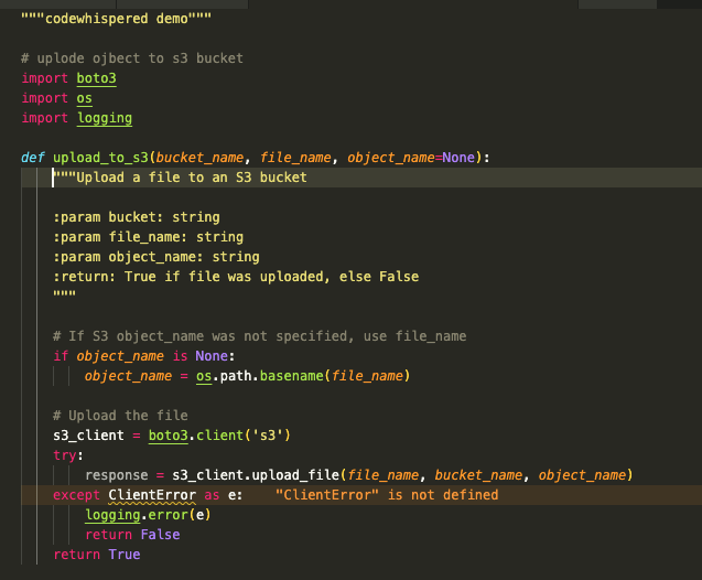 Writing meaningful comments helps to create more accurate codes, For example, I only typed the comment “# uplode object to s3 bucket” and the start of a function “def upload_to_s3”, then CodeWhispered suggested the rest.