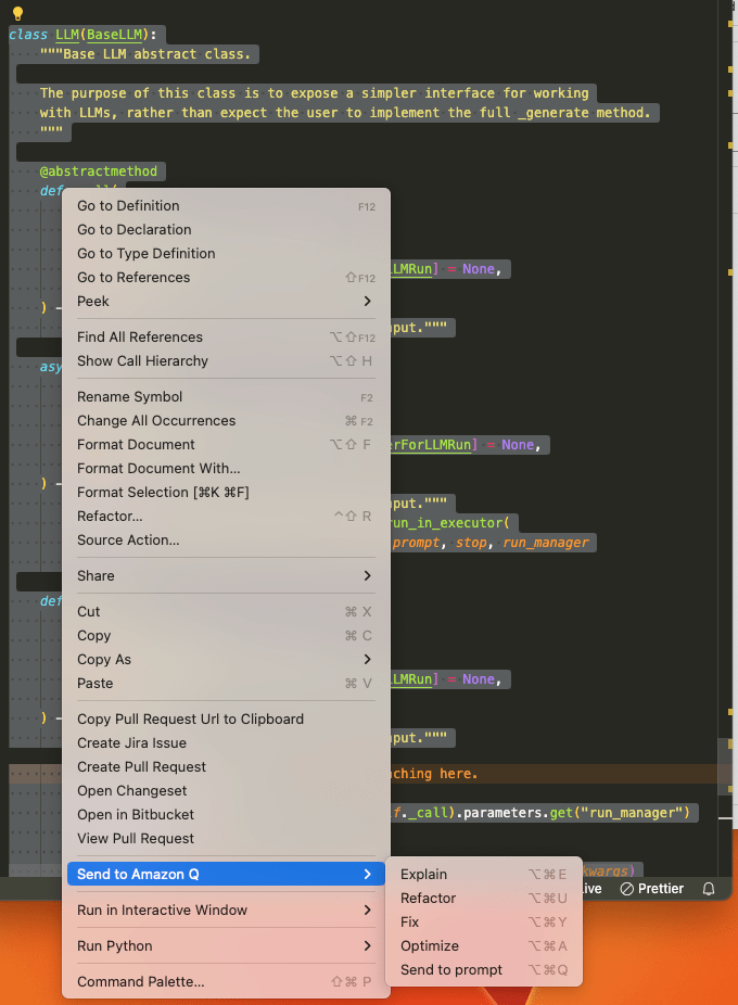 Amazon Q is so easy to use, just choose the piece of code you are interested to look into, then right click and choose the “Send to Amazon Q”. You can choose the pre-fined prompts (explain, refactor, fix, optimize) or just send the code then add your own prompt.