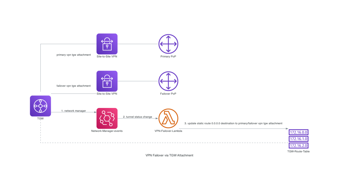 Continue with my previous post Automate VPN connection and its TGW attachment, in this post I would like to share the solution for VPN failover via TGW attachment. The key components in the solution are: Network Manager for Transit GatewayEventBridgeLambda The basic idea is: Register TGW to Network Manager, as Network Manager can monitor the tunnel … Continue reading Automate VPN failover via TGW attachment